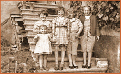 Les cousines, en grandes pompes, sur l'escalier donnant dans le jardin du grand père Louis.